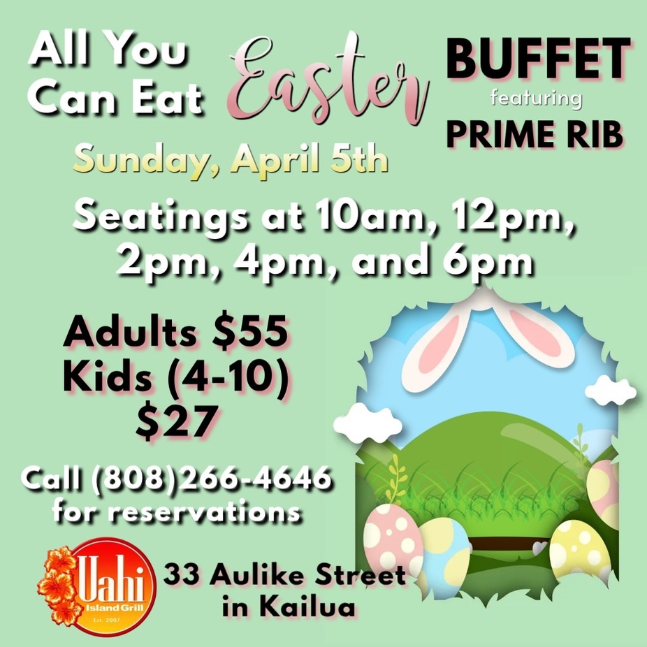 All You Can Easter Buffet featuring Prime Rib. Seatings at 10am, 12pm, 2pm,