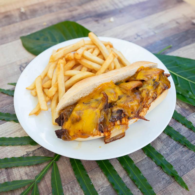 Korean BBQ beef, chili ailoli, kimchi, onion, bell pepper, cheddar cheese on a toasted baguette