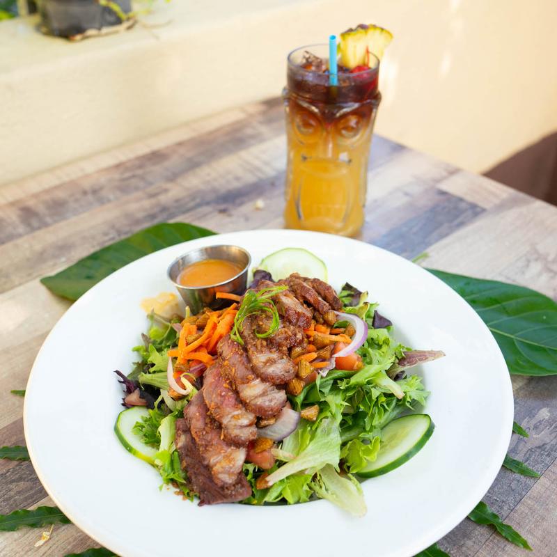 Grilled boneless chicken thigh with Jamaican inspired spices and a local huli-huli style marinade served over House garden salad