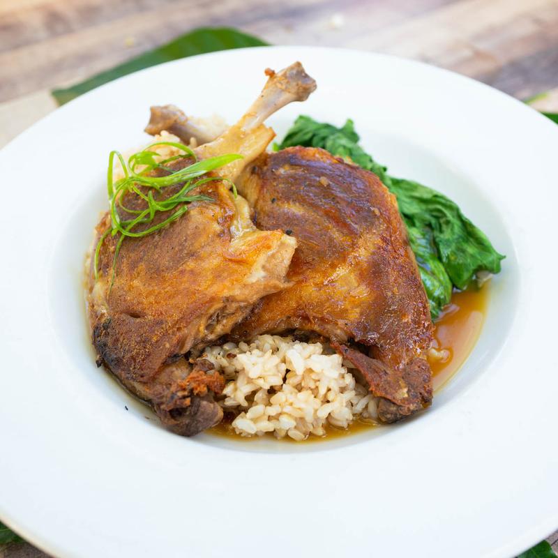 Slow-poached duck legs with orange-anise glaze. Includes rice and choy sum. Featured on Food Networks Diners, Drive Ins, and Dives